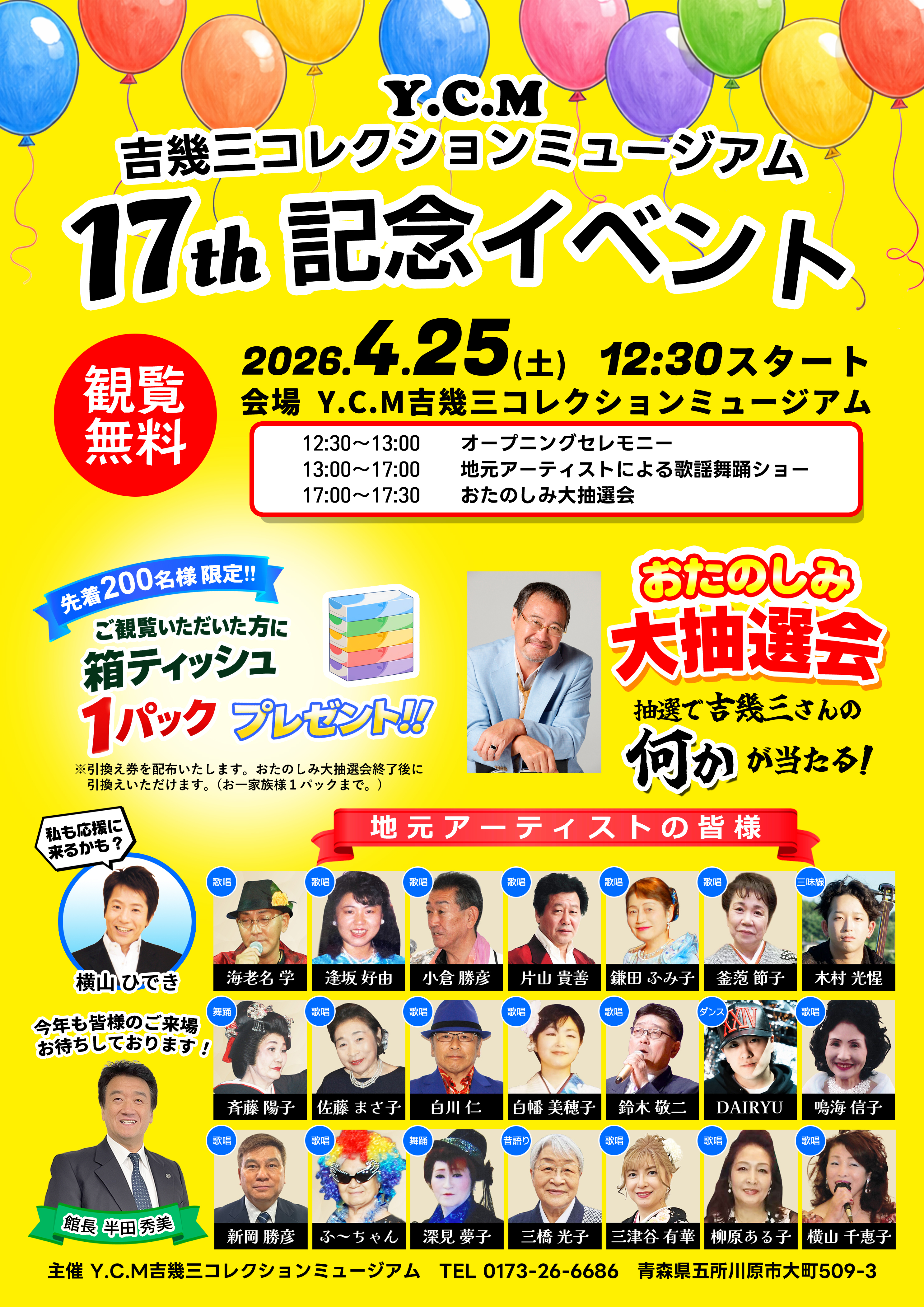 年に1度の観覧無料イベントですので、毎年多くの方にお越しいただいており、今年も吉幾三ミュージアムのアーティストメンバーの皆様による歌や踊り、昔語りや三味線の演奏など、音楽イベントをたっぷり4時間半お届けいたします!また、観覧の方には、箱ティッシュ(5個パック)プレゼント(先着200名様)や吉幾三さんの【何か】が当たるおたのしみ大抽選会もありますので、皆様ぜひお越しください‼
